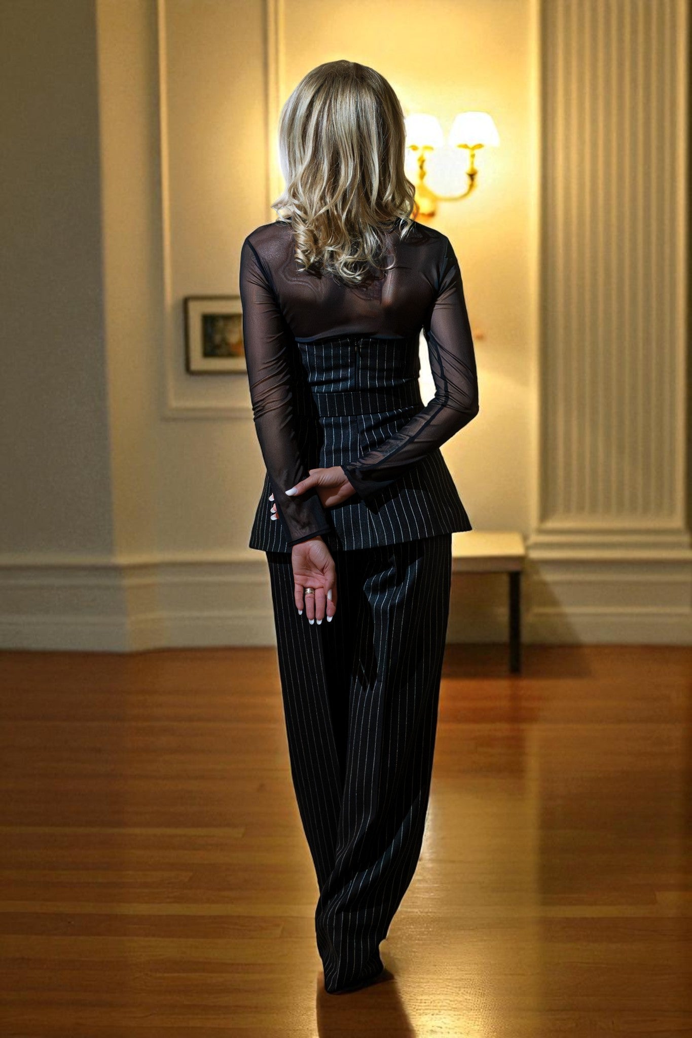 Compleu 3 piese: pantaloni, corset și bluză de plasă – eleganță urbană cu atitudine