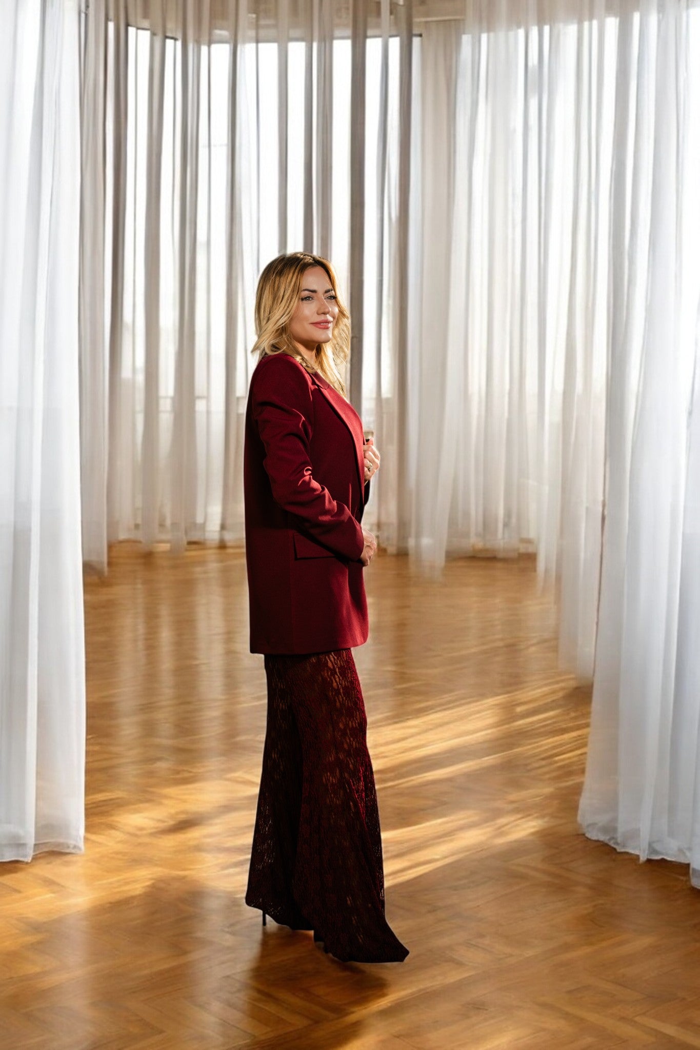 Compleu bordeaux format din pantaloni din dantelă fină și sacou oversized asortat. Croiala precisă și detaliile delicate din dantelă oferă un look feminin, rafinat și potrivit pentru evenimente speciale sau ocazii elegante.