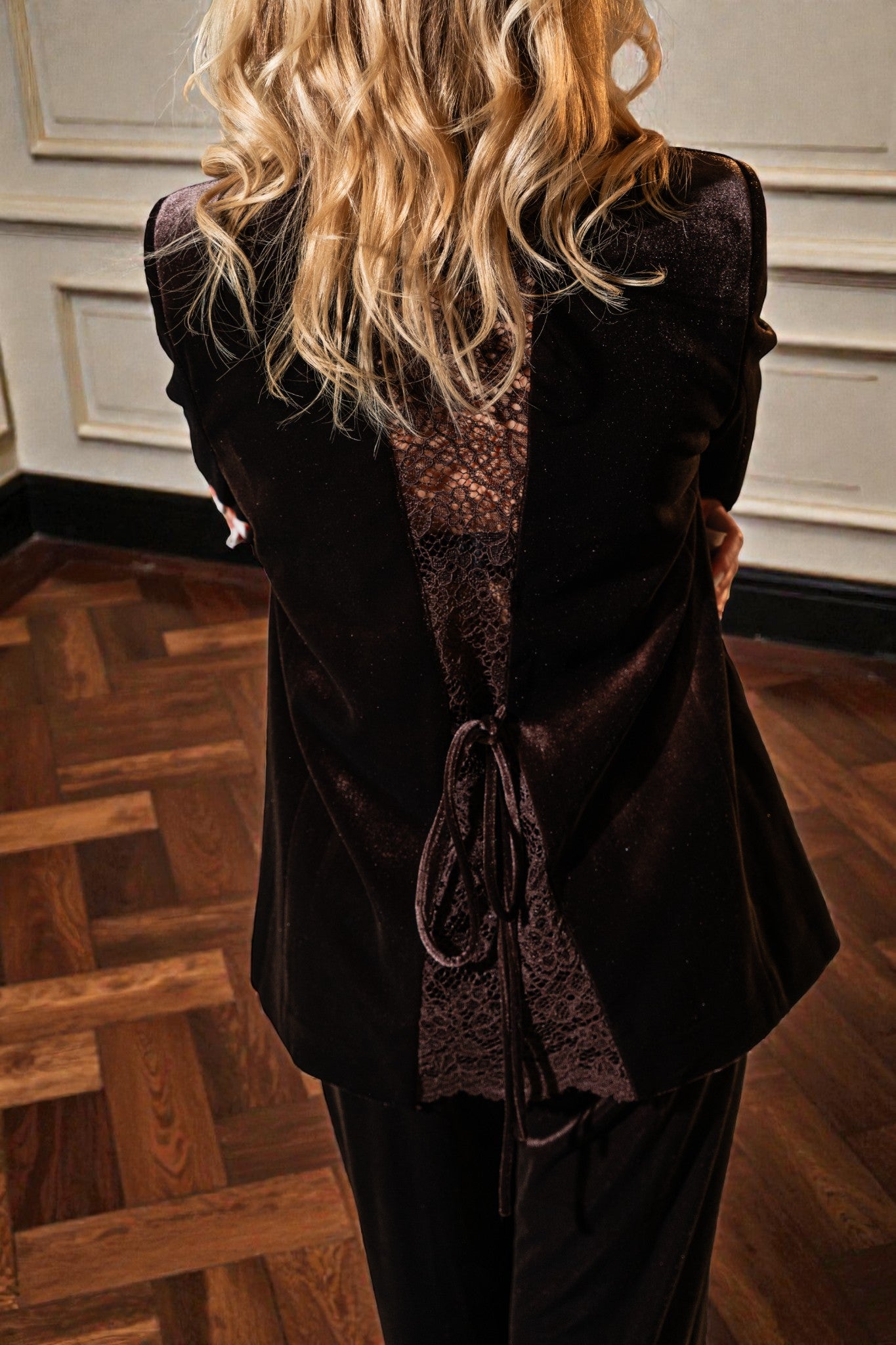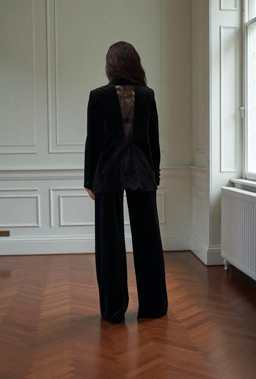 Un costum din catifea cu o linie impecabil de curată, creat pentru femeia care iubește minimalismul și rafinamentul. Textura fină a catifelei se împletește subtil cu accentele delicate de dantelă, adăugând o notă de feminitate și eleganță modernă. Designul simplu, dar sofisticat, evidențiază silueta și pune în valoare stilul personal, fără a-l încărca.