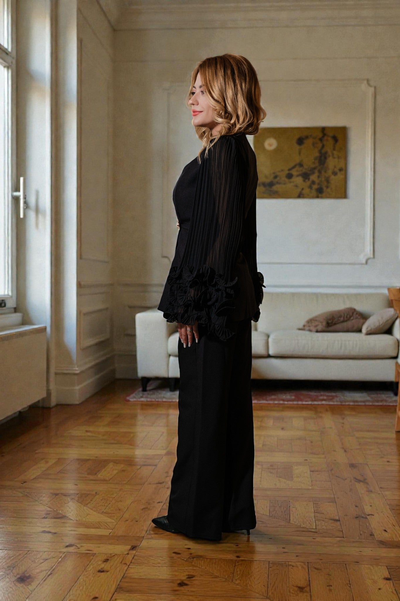 Costum de damă sofisticat, format din pantaloni eleganți și sacou cu mâneci lungi plisate din voal. Croiala sacoului se mulează subtil pe siluetă, evidențiind feminitatea, în timp ce mânecile vaporoase adaugă un aer delicat și modern. Pantalonii drepti completează perfect ținuta, oferind confort și stil, potrivit atât pentru birou, cât și pentru evenimente speciale. Materialele fine și atenția la detalii transformă acest costum într-o alegere rafinată și versatilă pentru garderoba feminină.