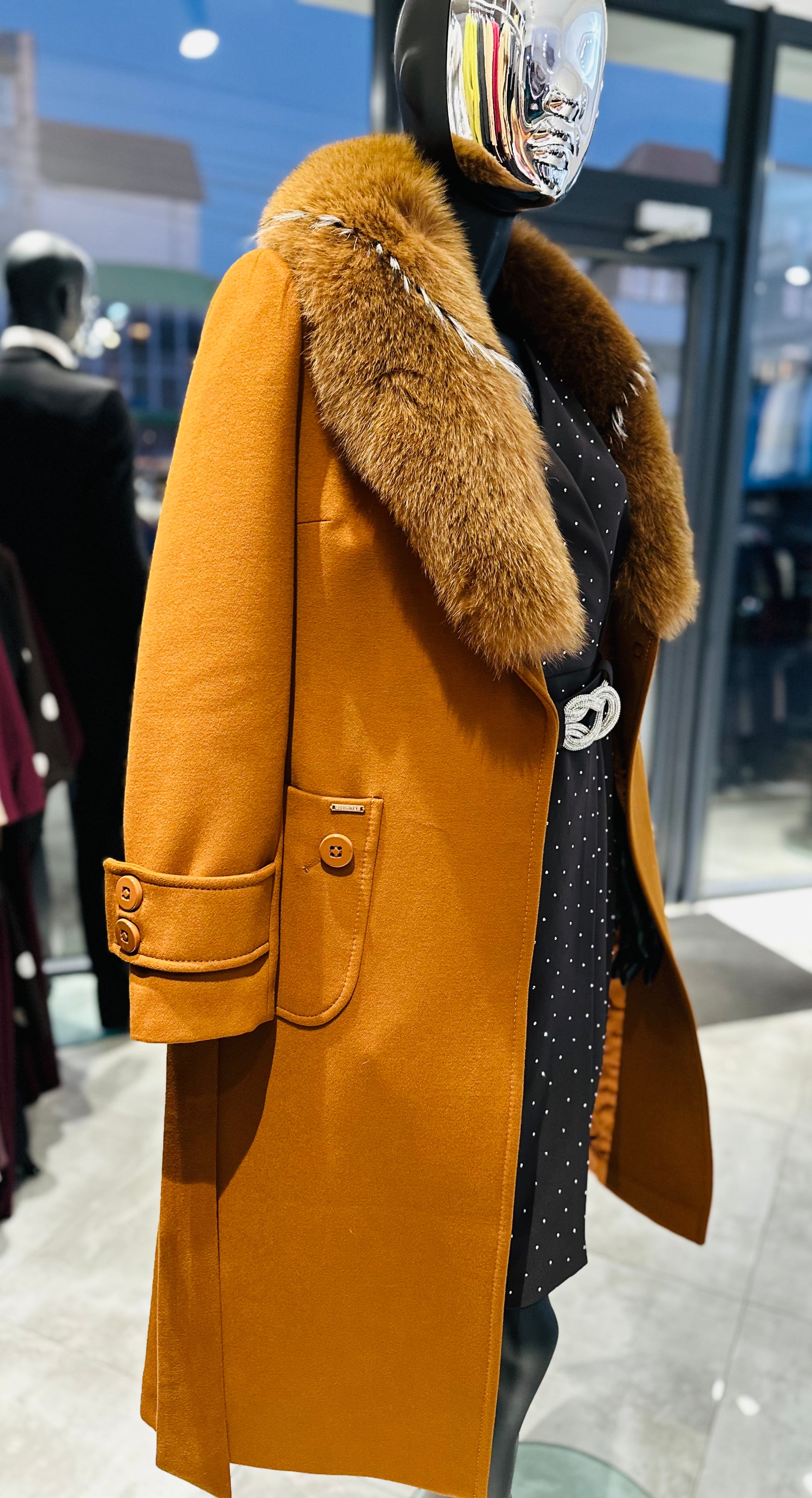 Palton elegant din lână cu blană naturală, ideal pentru zilele reci. Siluetă rafinată și finisaje premium.