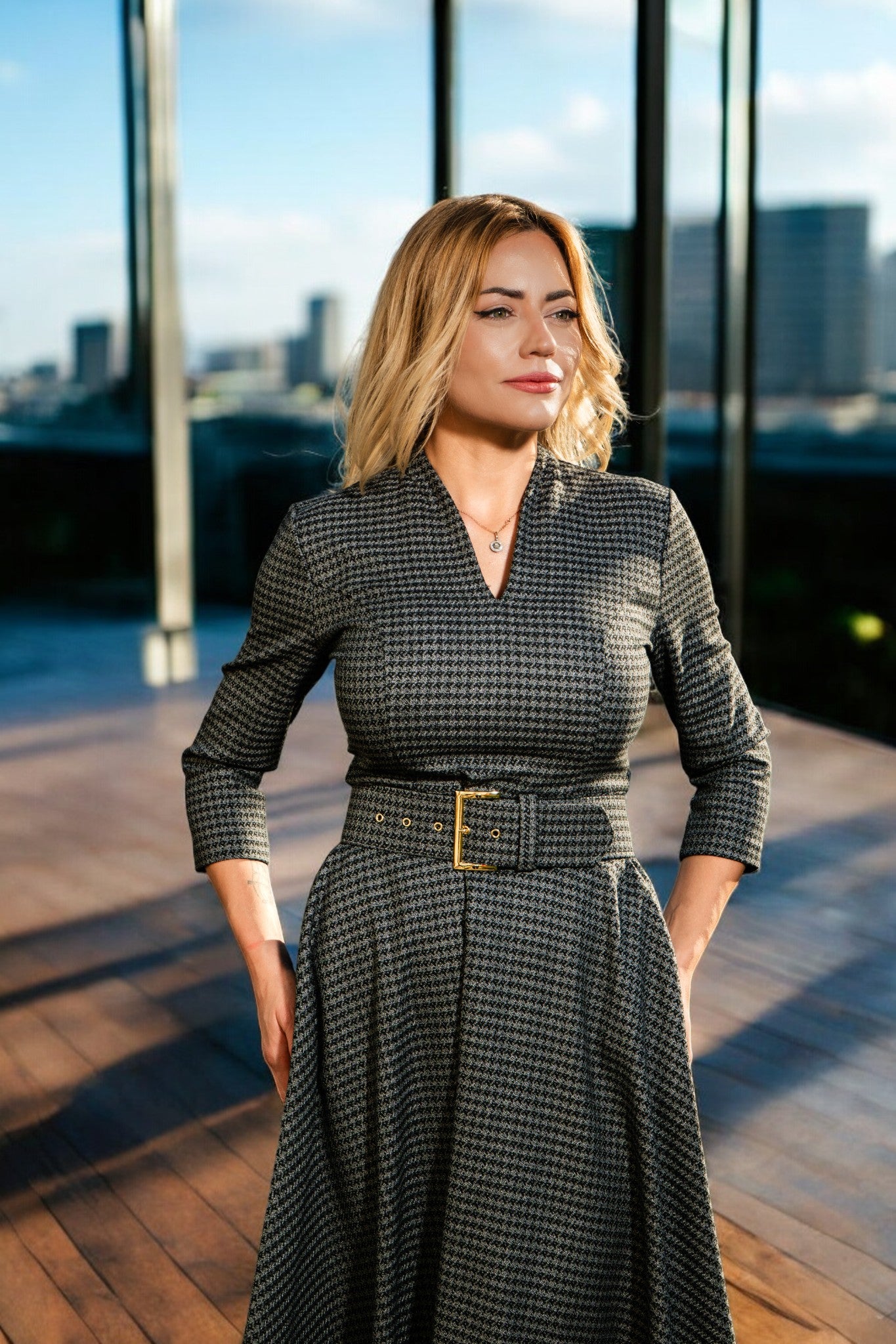 Elegantă și versatilă, această rochie office în carouri adaugă un plus de rafinament garderobei tale profesionale. Croiala cambrată evidențiază silueta, în timp ce imprimeul clasic în carouri oferă un aer sofisticat și modern. Realizată dintr-un material confortabil și ușor elastic, rochia asigură libertate de mișcare pe parcursul întregii zile. Gulerul discret, mânecile 3/4 și lungimea midi o fac potrivită atât pentru întâlniri de afaceri, cât și pentru o zi obișnuită la birou.