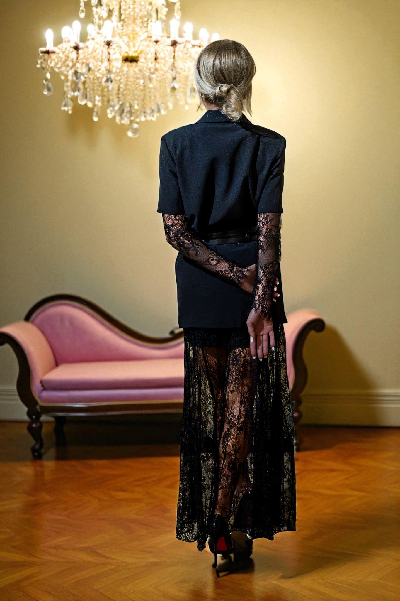 O declarație de stil modern și sofisticat, ce îmbină eleganța structurată a sacoului cu delicatețea și feminitatea dantelei. Fusta lunga, în nuanța clasică de negru, conturează silueta și oferă un aer rafinat, ideal pentru evenimente de seară și apariții cu stil.