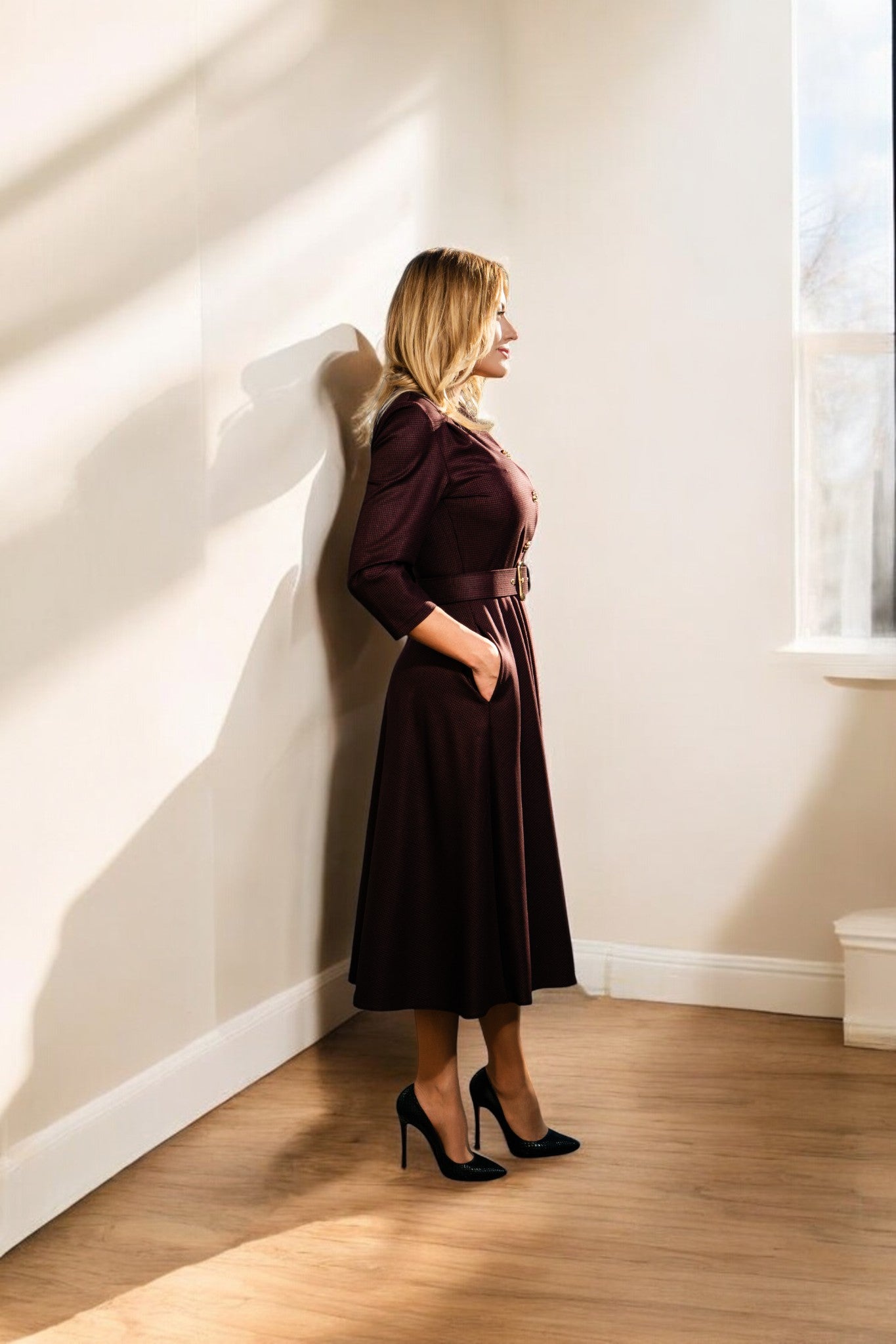 O rochie cloș cu centură în talie, ce combină feminitatea cu confortul. Textura fină și croiala armonioasă creează un look echilibrat și sofisticat, potrivit pentru diverse ocazii.