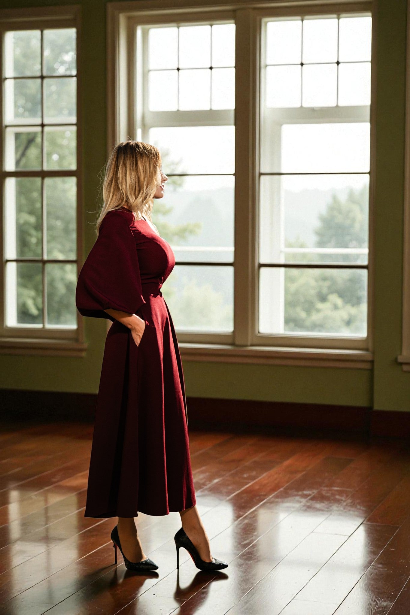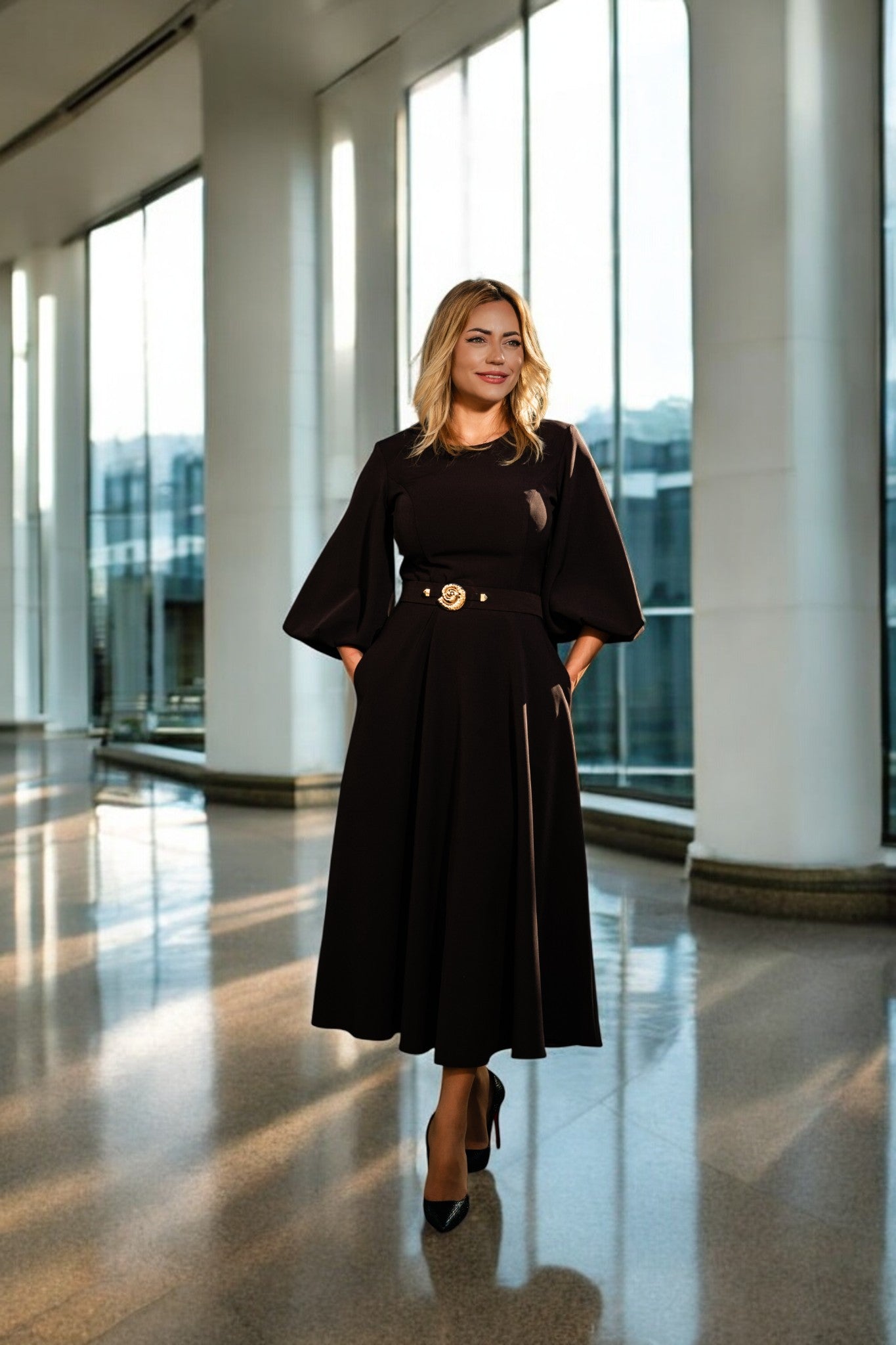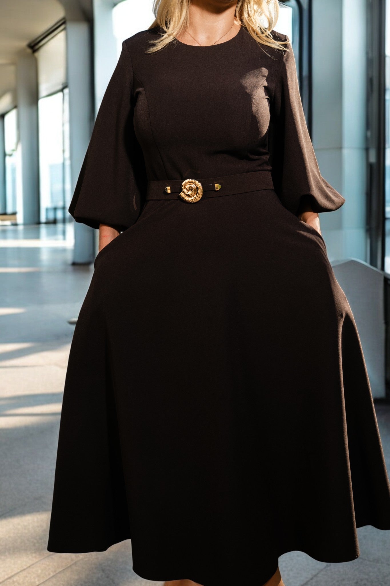 Rochie midi cu centură și accente aurii, realizată din material fin și confortabil. Designul minimalist și detaliile discrete adaugă un plus de rafinament și eleganță, pentru un look sofisticat și contemporan.
