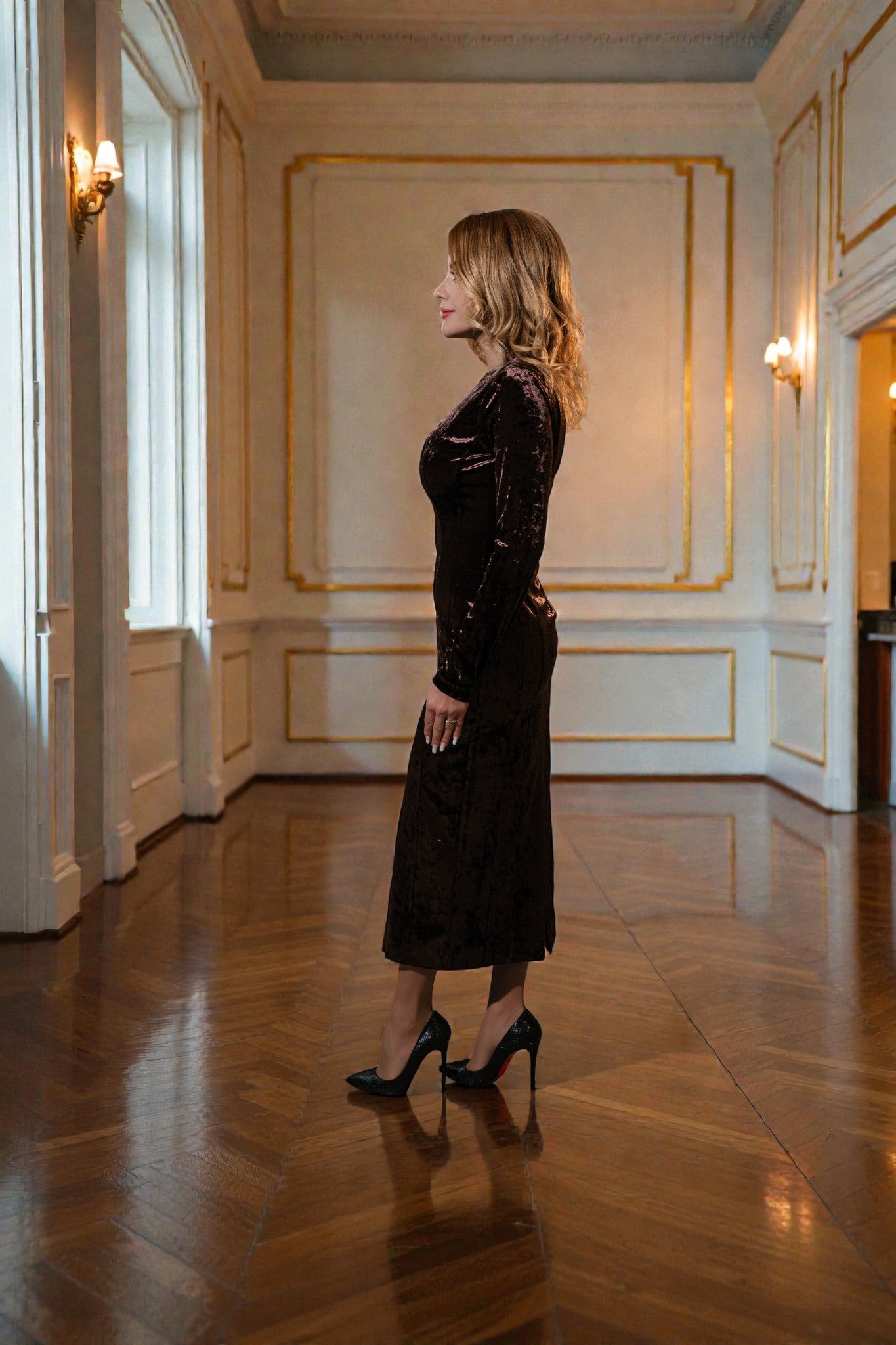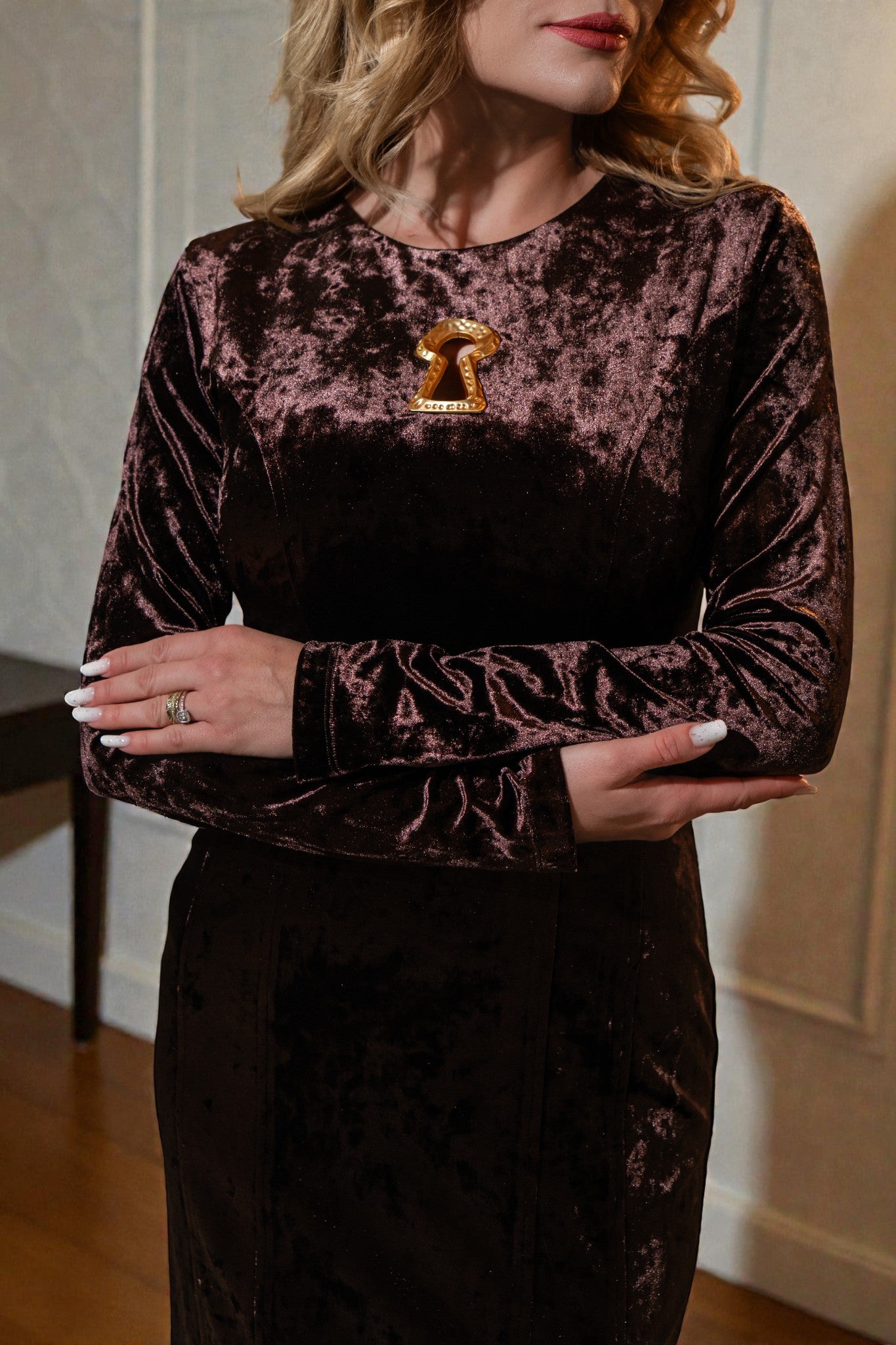 Rochie midi din catifea de calitate premium, cu o croială feminină și un detaliu auriu prețios în dreptul pieptului. Elementul decorativ adaugă profunzime și eleganță, transformând rochia într-o piesă statement delicată și rafinată. Ideală pentru seri elegante și ocazii unde strălucirea subtilă este de impact.