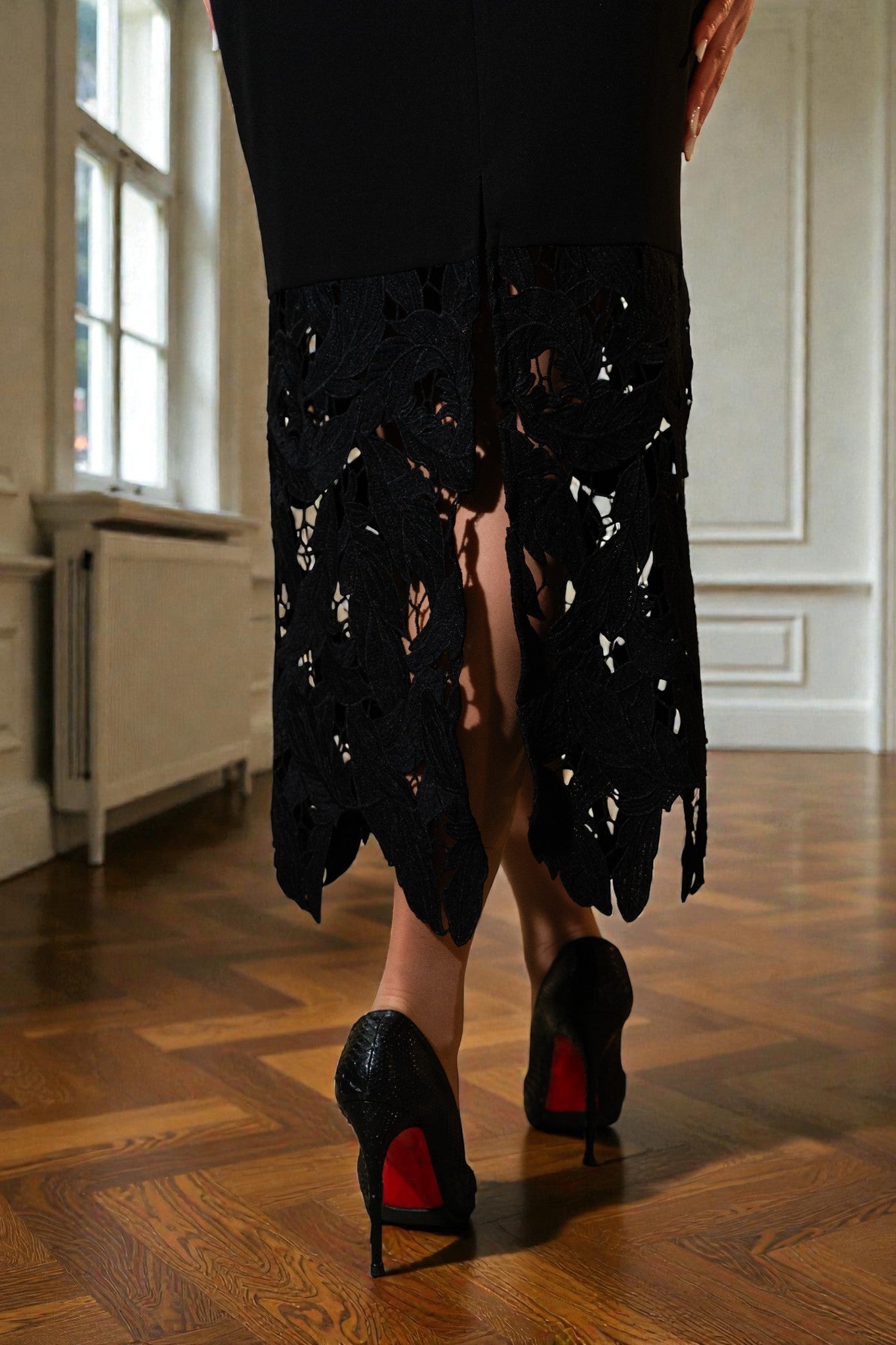 O rochie midi elegantă, realizată din material fluid care se așează natural pe corp. Tivul este decorat cu dantelă delicată, adăugând un detaliu feminin și sofisticat, iar centura în talie evidențiază silueta, conferind un look rafinat și armonios. Perfectă pentru evenimente speciale sau ocazii în care vrei să te simți elegantă și încrezătoare.