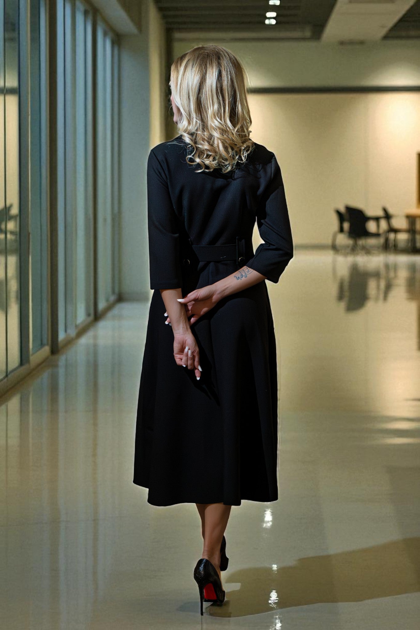 Clasică, dar cu un twist modern, această rochie neagră midi se remarcă prin eleganța sa atemporală și detaliile sofisticate. Croiala feminină evidențiază silueta, iar nasturii aurii adaugă o notă rafinată și ușor glam, transformând o piesă simplă într-un statement discret. Versatilă și ușor de accesorizat, această rochie este alegerea perfectă pentru birou, evenimente speciale sau o cină elegantă. O piesă must-have în garderoba oricărei femei.